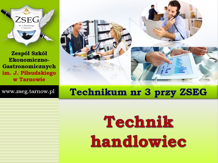 Zawód technika handlowca stwarza szanse zatrudnienia w dynamicznie rozwijającej się branży Technik handlowiec w ramach swoich zadań zawodowych sprzedaje towary oferowane w punktach sprzedaży detalicznej (sklepach, hipermarketach), drobnodetalicznej (w kioskach i na targowiskach), hurtowej (w hurtowniach) oraz sprzedaży e-commerse (sprzedaż internetowa). Wyszukuje dostawców towarów, kontaktuje się z partnerami handlowymi, prowadzi z nimi negocjacje, przygotowuje i zawiera umowy handlowe. Handlowiec stosuje różne formy i techniki sprzedaży, w zależności od szczebla obrotu towarowego, rodzaju towaru, rynku oraz oczekiwań klienta. Technik handlowiec samodzielnie lub współpracując z innymi komórkami organizacyjnymi przedsiębiorstwa może prowadzić również inne działania, np. w zakresie analizy rynku, marketingu, kalkulacji cen, analizy kosztów handlowych.