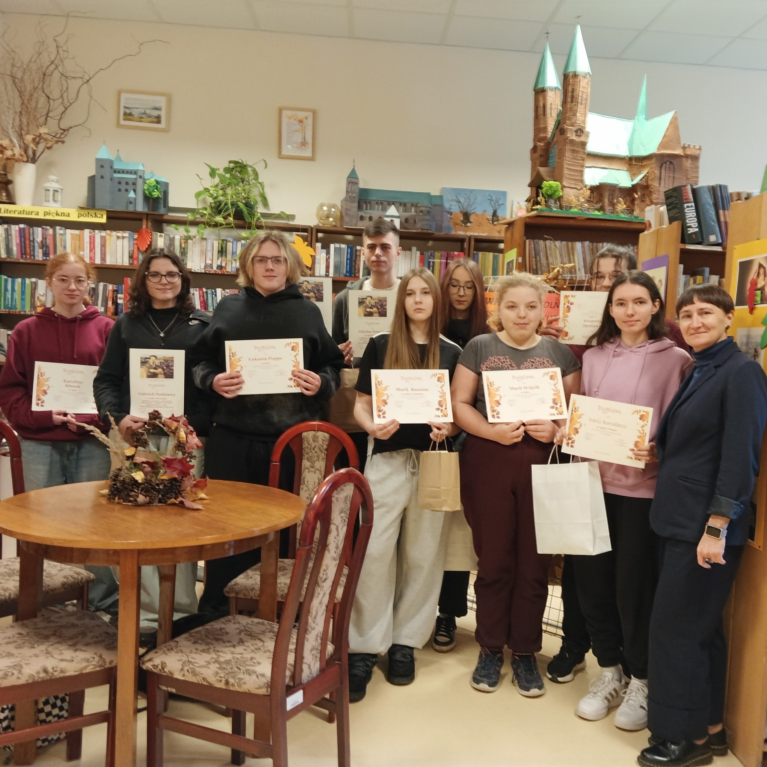 W poniedziałek 1 grudnia 2025 r. w bibliotece szkolnej odbyło się wręczenie nagród laureatom konkursów literackich i plastycznych. Gratulujemy zwycięzcom konkursu „Twarze jesieni”, wśród których znaleźli się: Daria Barabasz z kl. III TR, Maria Ramian z kl. I TD oraz Julia Ciężkowska z kl. III TD.